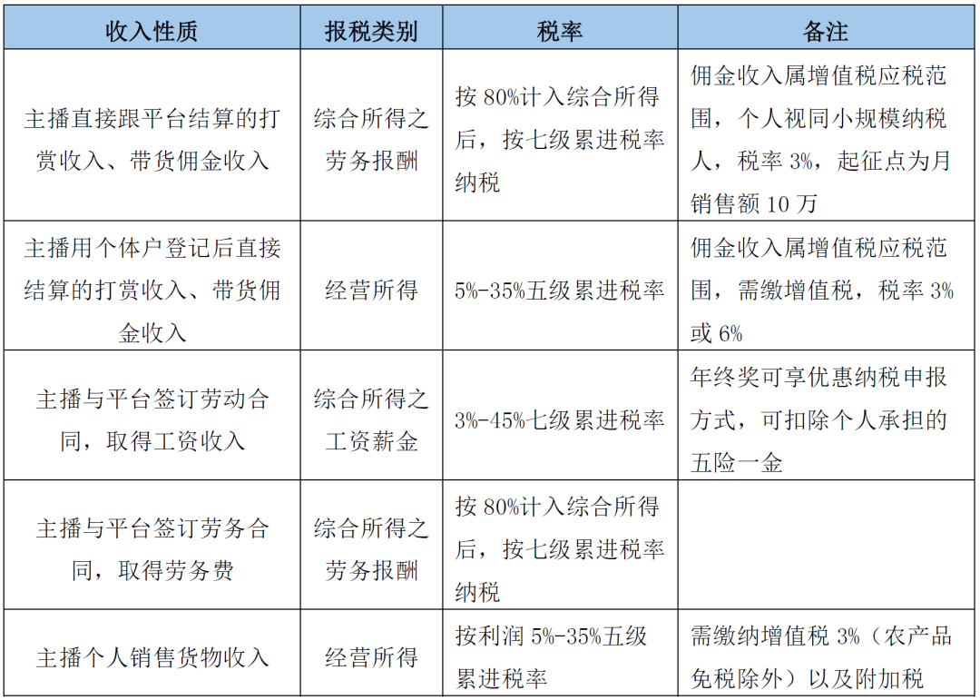 个人从业者收入类型相对复杂,如打赏收入、带货收入、坑位费收入、广告费收入、佣金收入、公会结算劳务收入等。根据个人所得税规定,个税申报需按不同类别适用不同税率,如下: