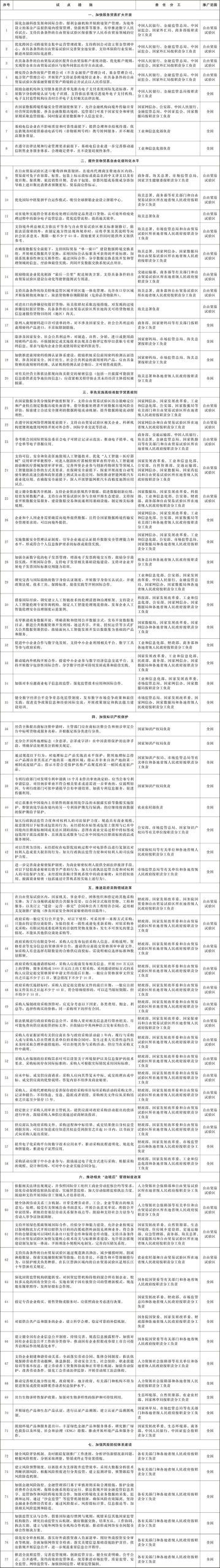 自由贸易试验区全面对接国际高标准经贸规则推进高水平制度型开放试点措施复制推广任务表