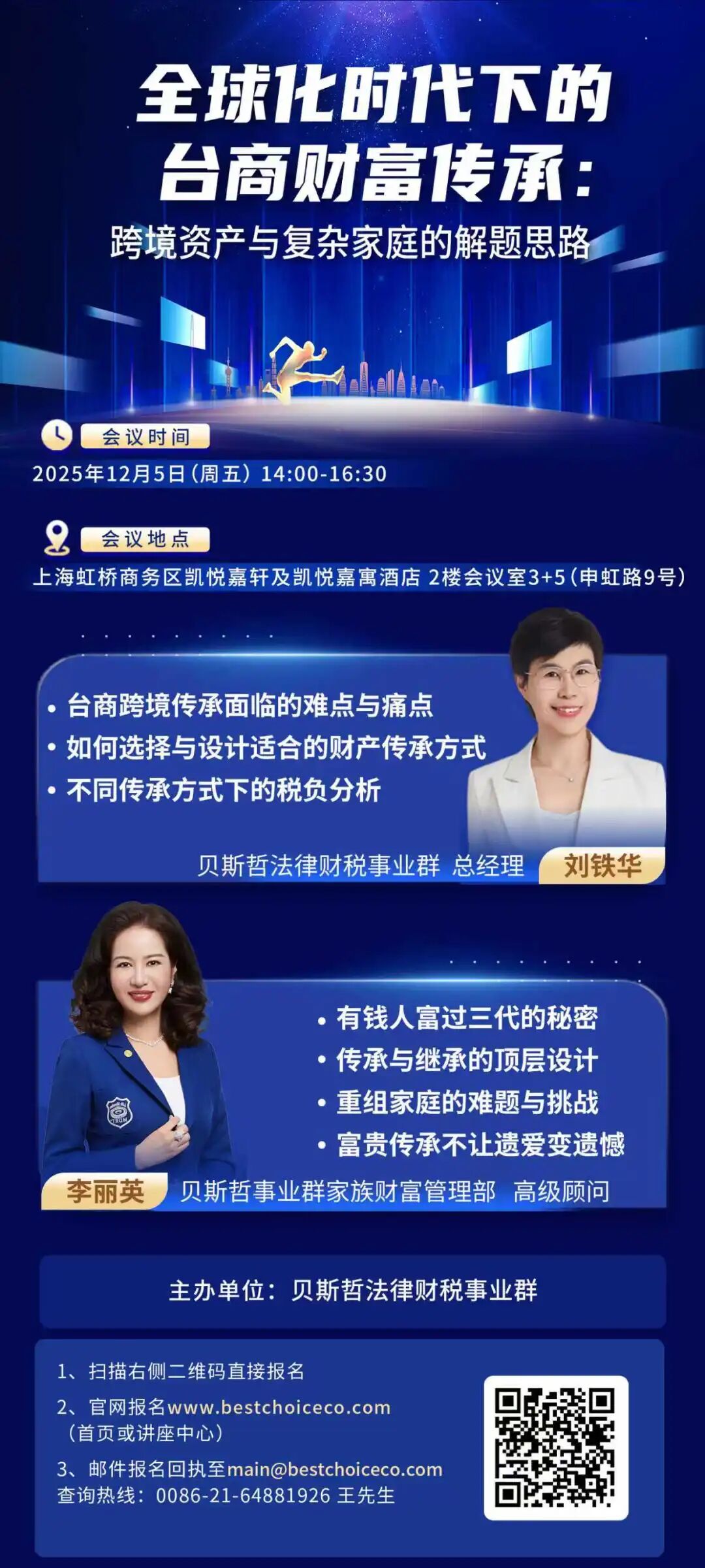 2025年12月5日下午,我们将在上海虹桥凯悦嘉轩酒店举办《全球化时代下的台商财富传承:跨境资产与复杂家庭的解题思路》的主题讲座,除了由贝斯哲事业群总经理刘铁华女士针对台商跨境传承面临的痛点与难点进行分析以外,更邀请了事业群家族财富管理部的高级顾问李丽英女士,对传承与继承的顶层设计给出独到的见解与分析。