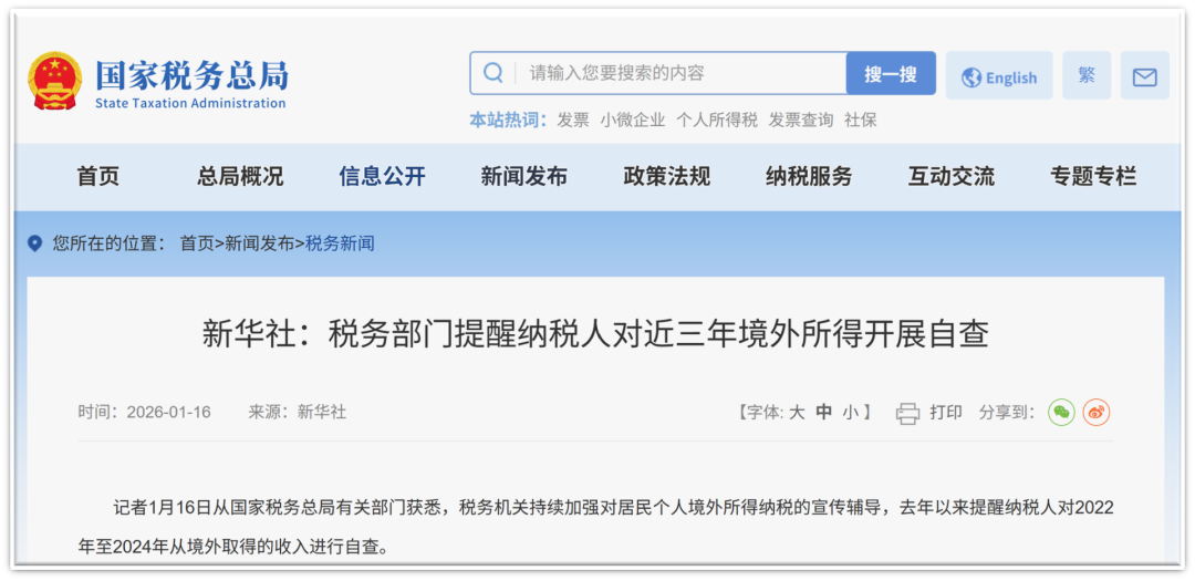 税务部门提醒纳税人对近三年境外所得开展自查。