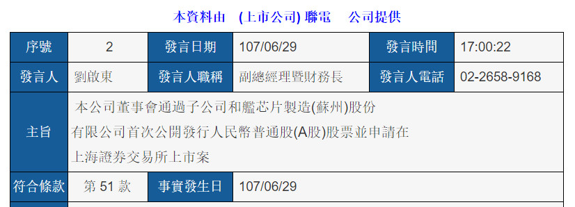 據台灣聯華電子股份有限公司(以下簡稱“聯電”)6月29日公告顯示,聯電董事會已經通過了子公司和艦芯片製造(蘇州)股份有限公司(以下簡稱蘇州和艦)首次公開發行人民幣普通股(A股)股票並申請在上海證券交易所上市案,引起各大媒體爭相報道。