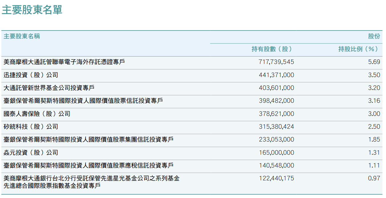 從股權架構上來看,和艦公司的控股股東為Oakwood Associates Limited。而聯電通過間接持股方式,持有和艦公司96.66%的股份,聯電毫無疑問是和艦公司的實際控制人。但,由於聯電公司的上層投資人股權極為分散(見下圖聯電公司的主要股東名單),第一大股東的持股比例也只不過在5.69%,可以認定為聯電公司本身並無實際控制人,也因此,將作為發行人的蘇州和艦解釋為無實際控制人也在情理之中。