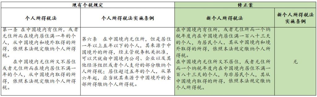 从上表可见,现有个税中有关“5年以上外籍个人全球所得纳税”的规定是《实施条例》的条款内容,现有个人所得税法的规定也是超过1年的外籍个人需就全球所得纳税,新个税法将1年更换为183天,故是否还会给予5年的优惠,要看《实施条例》如何修定,目前尚无定论。