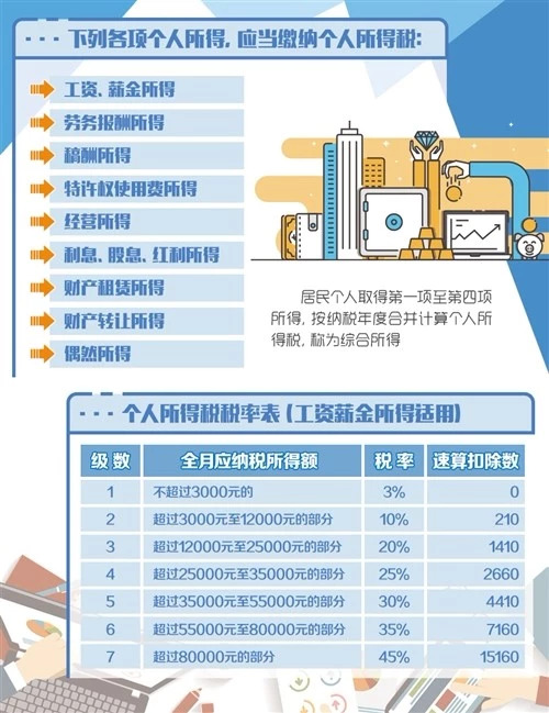新个税法结合当前征管能力和配套条件等实际情况,将工资、薪金所得,劳务报酬所得,稿酬所得,特许权使用费所得等4项劳动性所得(称为“综合所得”)纳入综合征税范围,适用统一的超额累进税率,居民个人按年合并计算个人所得税。