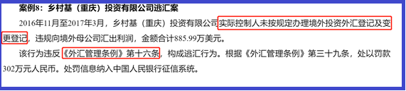 另外也需要特别提示的是,根据37号文第五条,如“已登记境外特殊目的公司发生境内居民个人股东、名称、经营期限等基本信息变更,或发生境内居民个人增资、减资、股权转让或置换、合并或分立等重要事项变更后,应及时到外汇局办理境外投资外汇变更登记手续。”如未进行变更登记者,也会遭受处罚。这在今年5月20日国家外汇管理局公布的17起外汇违规典型案例中已有体现: