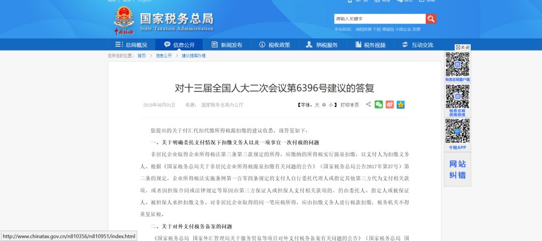 2019年8月1日,国家税务总局在官方网站上发布了《对十三届全国人大二次会议第6396号建议的答复》(以下简称《答复》)。
