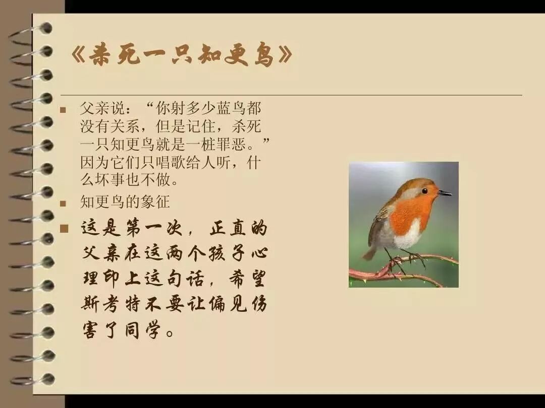 在美国南方有这样一句俗语:杀死知更鸟是一种罪恶。电影的同名原著小说《杀死一只知更鸟》就是取名自这句俗语,但是略去了后面的“是一种罪恶 ”,所以从名字看来更像是对一种事件的陈述,这种客观的平静中暗藏着控诉的力量。知更鸟除了高唱动人的歌曲,不做任何伤害他人的事情,不破坏花草,不毁坏谷仓,只是为了愉悦听众而尽情歌唱。所以打死这样无害的生灵就是一种罪恶,一种毫无意义的残杀。