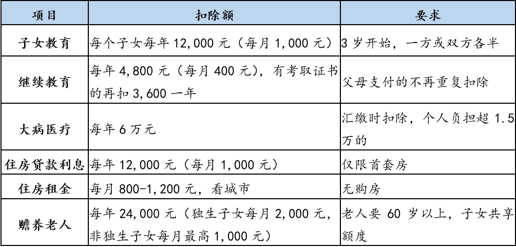 个人所得税的起征点虽然为0,但并不是说,只要有收入就一定会产生个人所得税。上述综合所得除了所得额本身的扣除标准之外,新个人所得税法同时还增加了六项专项附加扣除项目,如下表: