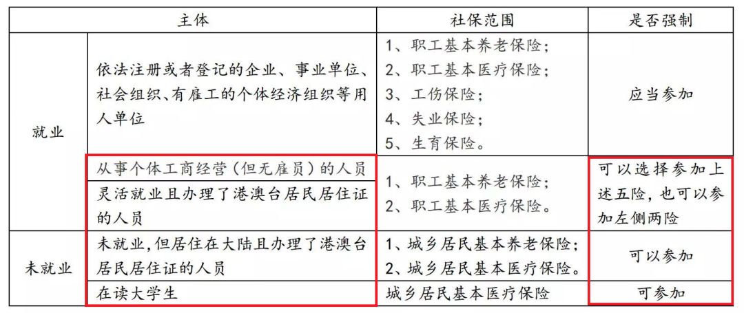 2、除此外如个体工商经营者、在大陆居住但未就业者,及就读学生等,使用的是“可以”而非“应当”,实际上是赋予了该类人员的自主选择权。