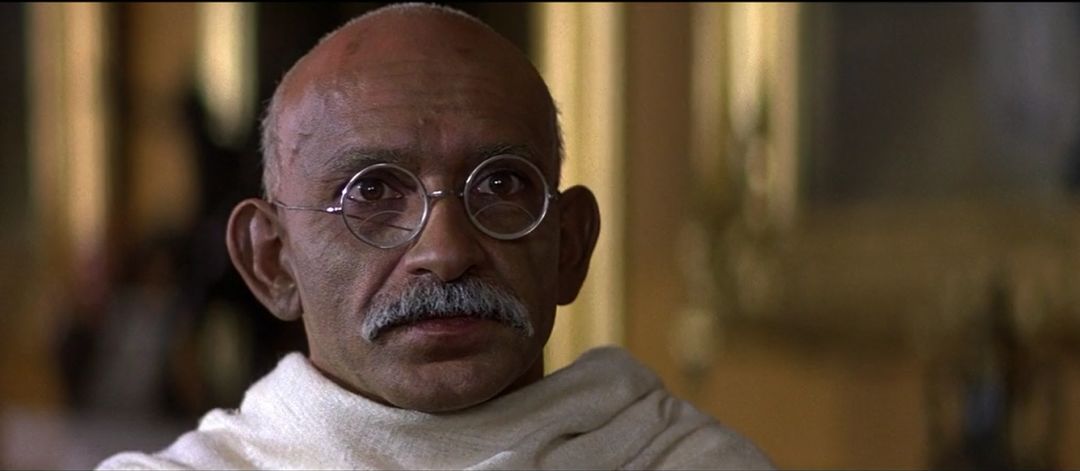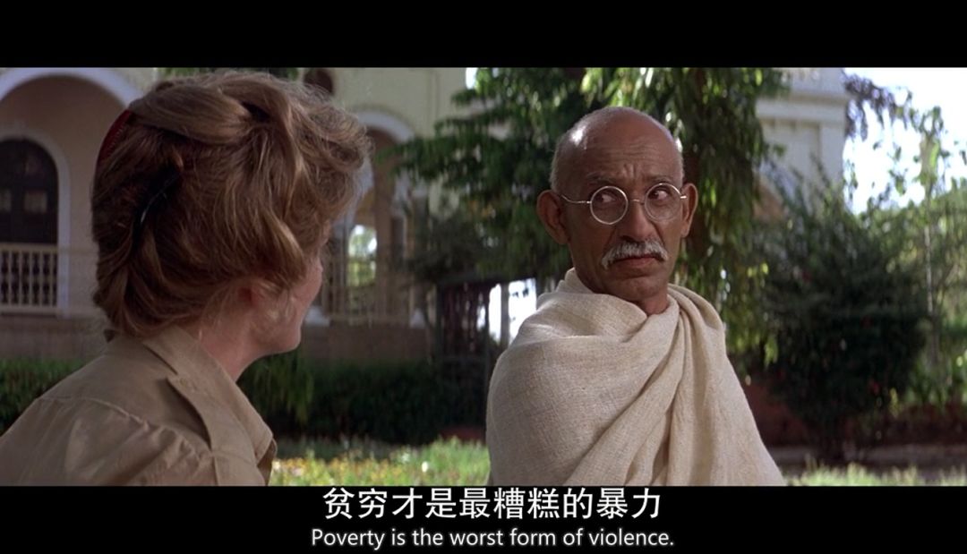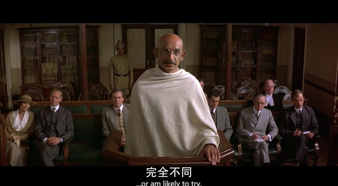 电影从1948年他被刺杀倒叙着这位被尊称为“圣雄”的印度小个子的一生,并从中截取了最具代表性的事件重点刻画。例如开篇的去南非的遭遇首先给他当头一击,接着是带领在南非的印度移民抗衡英国殖民地统治者的种族歧视,如有色人种上街必须携带当局发放的证件,在大街上行走不能走在人行道上。