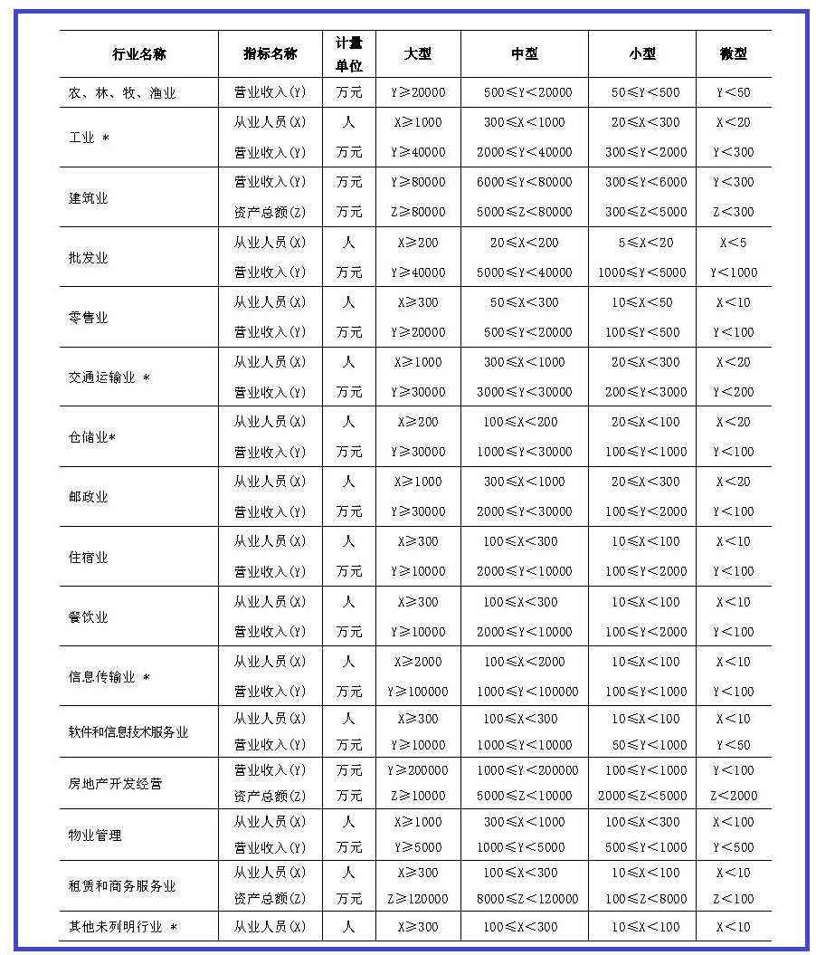 说明:大型、中型和小型企业须同时满足所列指标的下限,否则下划一档;微型企业只须满足所列指标中的一项即可。