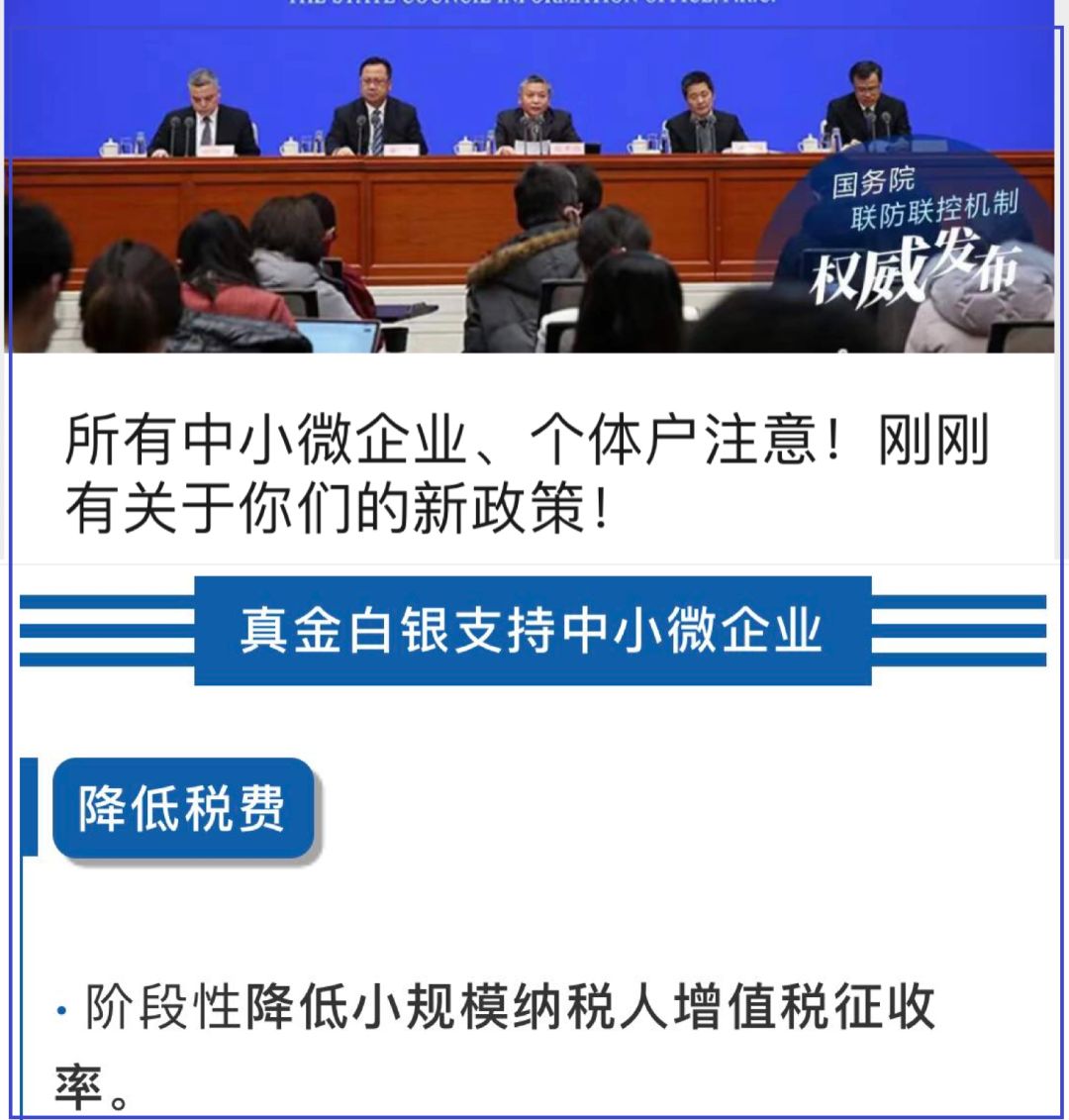 2月27日的中国政府网有发布题为《所有中小微企业、个体户注意!刚刚有关于你们的新政策!》的文章中,针对中小微企业提出了“阶段性降低小规模纳税人增值税征收率”的政策,与今天发布的13号公告内容相吻合。