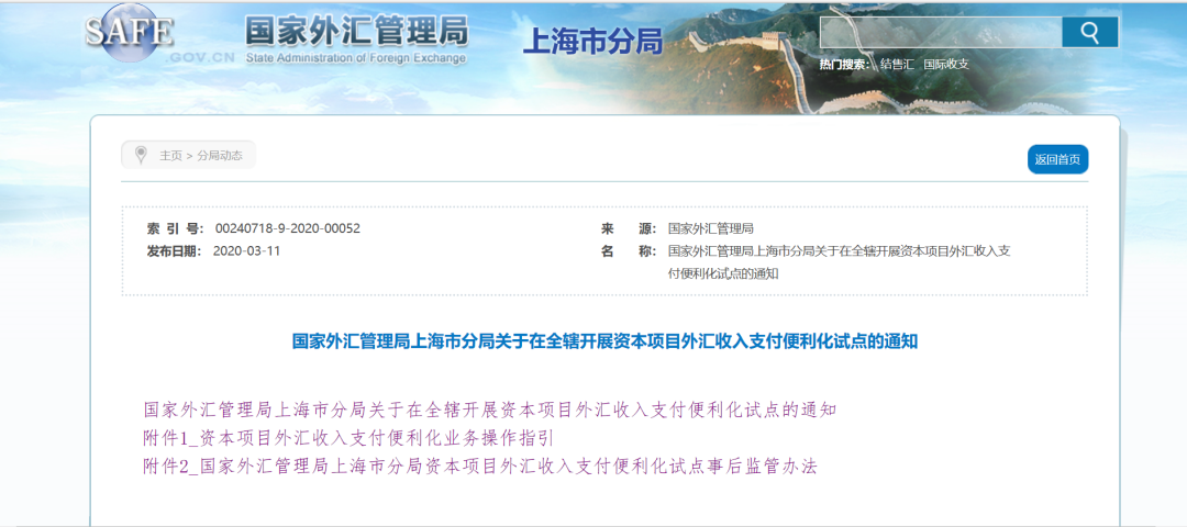 2020年3月11日,国家外汇管理局上海市分局发布上海汇发[2020]8号《关于在全辖开展资本项目外汇收入支付便利化试点的通知》(以下简称《通知》),规定在上海市全辖范围内符合条件的企业可试点资本项目外汇收入支付便利化业务。