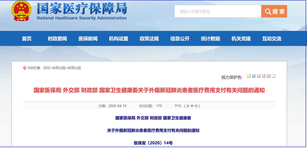 4月15日,国家医保局、外交部、财政部及国家卫生健康委联合发布《关于外籍新冠肺炎患者医疗费用支付有关问题的通知》(以下简称《通知》),针对确认新冠肺炎和疑似患者的外籍人员医疗费用等事宜,进行了如下规定: