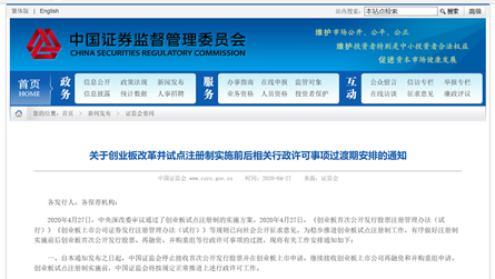 5、通知发布之日起,中国证监会停止接收首次公开发行股票并在创业板上市申请,继续接收创业板上市公司再融资和并购重组申请。创业板试点注册制实施前,中国证监会将按规定正常推进上述行政许可工作。