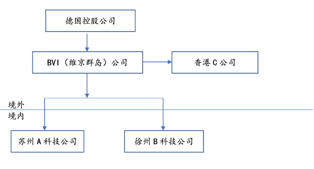 第一步:采用特殊性税务处理方式,BVI公司将其全资拥有的徐州B科技公司的股权转让给苏州A科技公司,BVI公司并同时承诺在重组后连续12个月内,不转让其所取得的苏州A公司股权。本次调整后:
