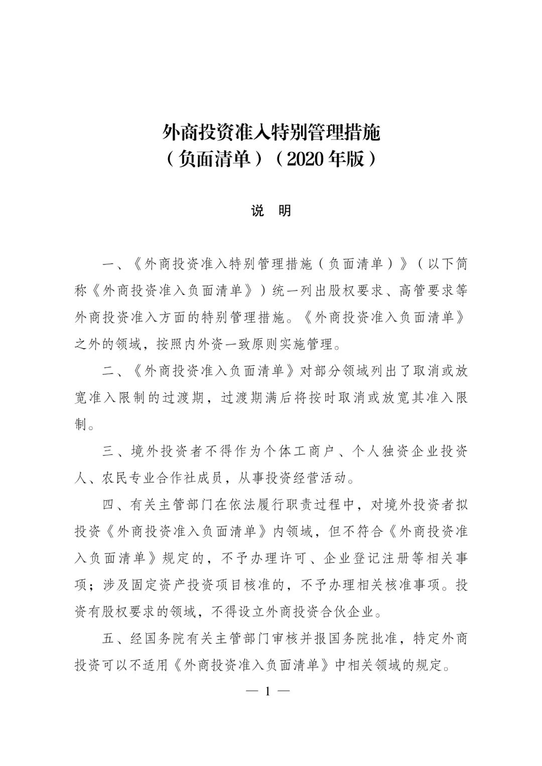 6月23日,国家发展改革委、商务部发布第32号令《外商投资准入特别管理措施(负面清单)(2020年版)》和第33号令《自由贸易试验区外商投资准入特别管理措施(负面清单)(2020年版)》,自2020年7月23日起施行。《外商投资准入特别管理措施(负面清单)(2019年版)》和《自由贸易试验区外商投资准入特别管理措施(负面清单)(2019年版)》同时废止。
