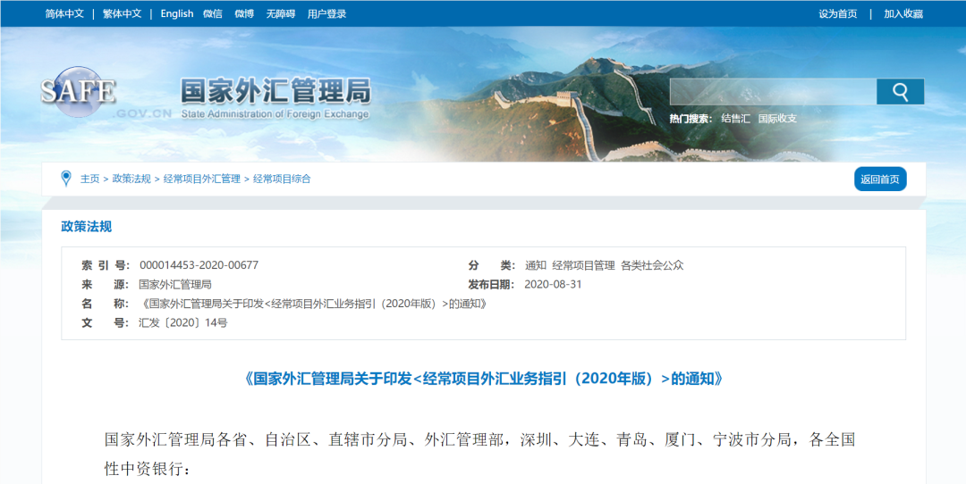 《关于印发<经常项目外汇业务指引(2020年版)>的通知》