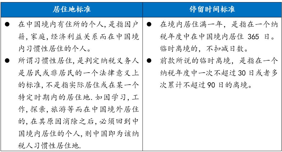 以各国对于税收居民的认定标准来说,大多采用居住地和停留时间这两个标准。中国也一样。根据《中华人民共和国个人所得税法》及其实施条例,以及《征收个人所得税若干问题的规定》,税收居民是指“在中国境内有住所,或者无住所而在境内居住满一年的个人”,其从中国境内和境外取得的所得,应依法缴纳个人所得税。